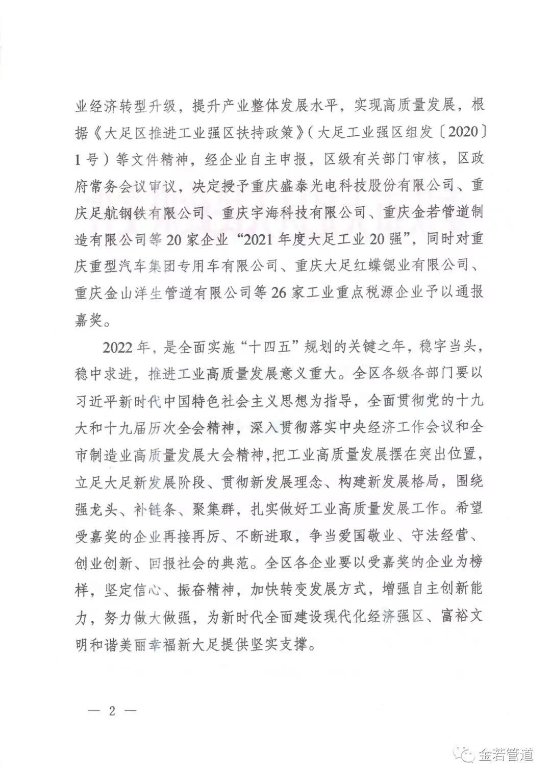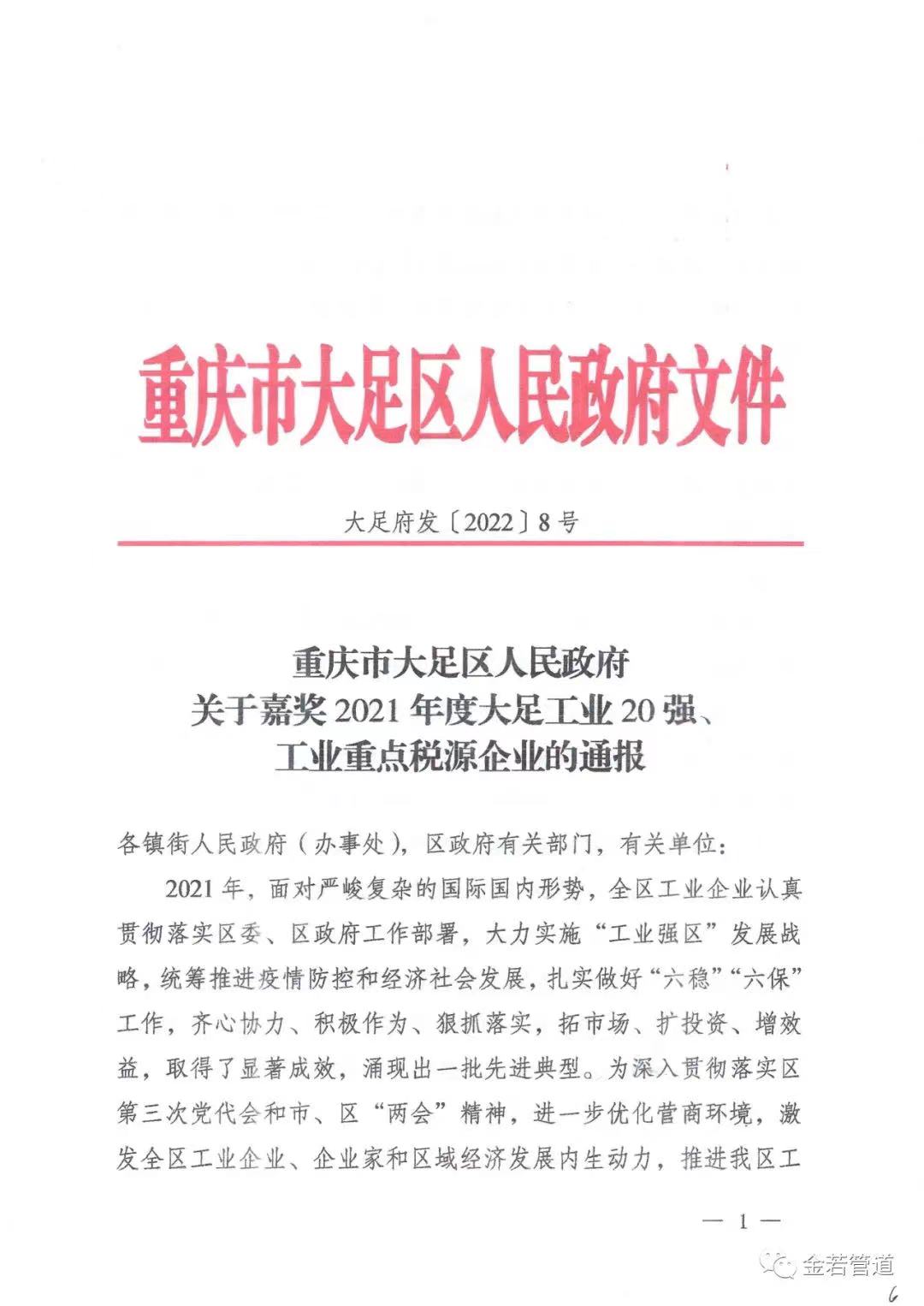 重慶市大足區(qū)政府為深入貫徹落實(shí)第三次黨代會(huì)和市、區(qū)“兩會(huì)”精神,進(jìn)一步優(yōu)化營(yíng)商環(huán)境,激發(fā)全區(qū)工業(yè)企業(yè)、企業(yè)家和區(qū)域經(jīng)濟(jì)發(fā)展內(nèi)生動(dòng)力,經(jīng)區(qū)級(jí)有關(guān)部門(mén)審核,區(qū)政府常務(wù)會(huì)議審核,3月2日,在全區(qū)企業(yè)“2021年度大足工業(yè)”,我司位列于20強(qiáng)名單之中。